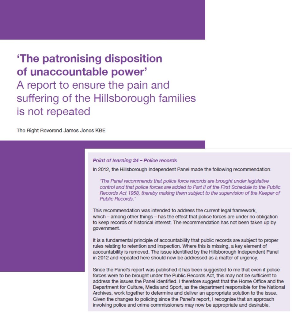 Unlike Scotland, who not only revised their equivalent Public Records Act in 2011, but included Police Scotland in the new Act, or the Police Service of Northern Ireland who were included in the Northern Ireland version of the Public Records Act, in England and Wales there seems to be little appetite for such a move and it is increasingly unlikely that police records will become public records. Generally Hillsborough, as with many high profile disasters, has been the catalyst for campaigns towards greater accountability and this has included the drafting of the Public Authority (Accountability) Bill sponsored in 2017 by Andy Burnham — a Bill which has, as yet, to be passed by the current government (2022).