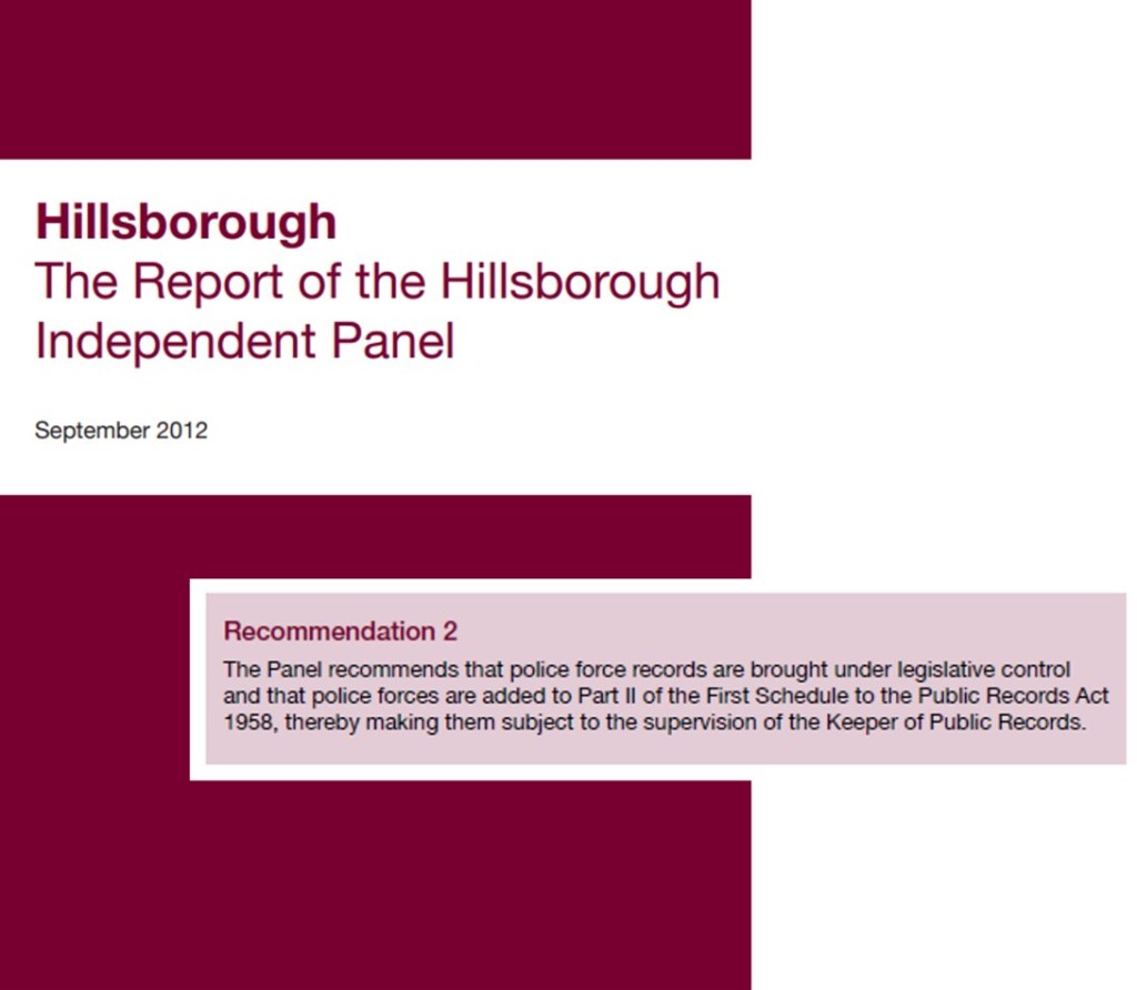 The Open University History Department (where I’m now a visiting fellow and consultant) has, for a number of years, been interested in the preservation of policing records. Part of the work of their Centre for the history of crime, policing and justice has been to participate in initiatives to press for the inclusion of police forces in the Public Records Act, a cause which was catapulted to the fore in the aftermath of the Hillsborough stadium disaster of 1989. Both the Report of the Hillsborough Independent Panel and the later report by Bishop James Jones recommended either inclusion of police records in the Public Records Act, or some other ‘appropriate solution,’ to ensure greater consistency and regulation around what police records were selected for preservation (and not the haphazard situation I had encountered).